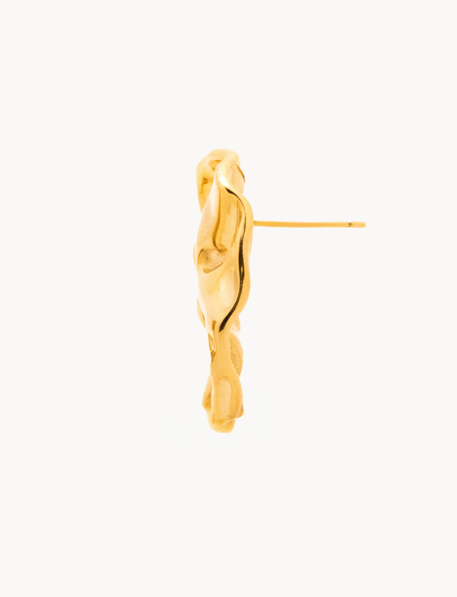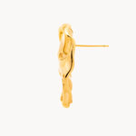 Orecchini a disco irregolare in acciaio inox dorato, caratterizzati da una superficie modellata a onde fluide che riflette la luce con effetti sempre diversi. Il design scultoreo e tridimensionale dona personalità e carattere, rendendoli un accessorio d’impatto perfetto per chi ama i gioielli moderni e distintivi.
