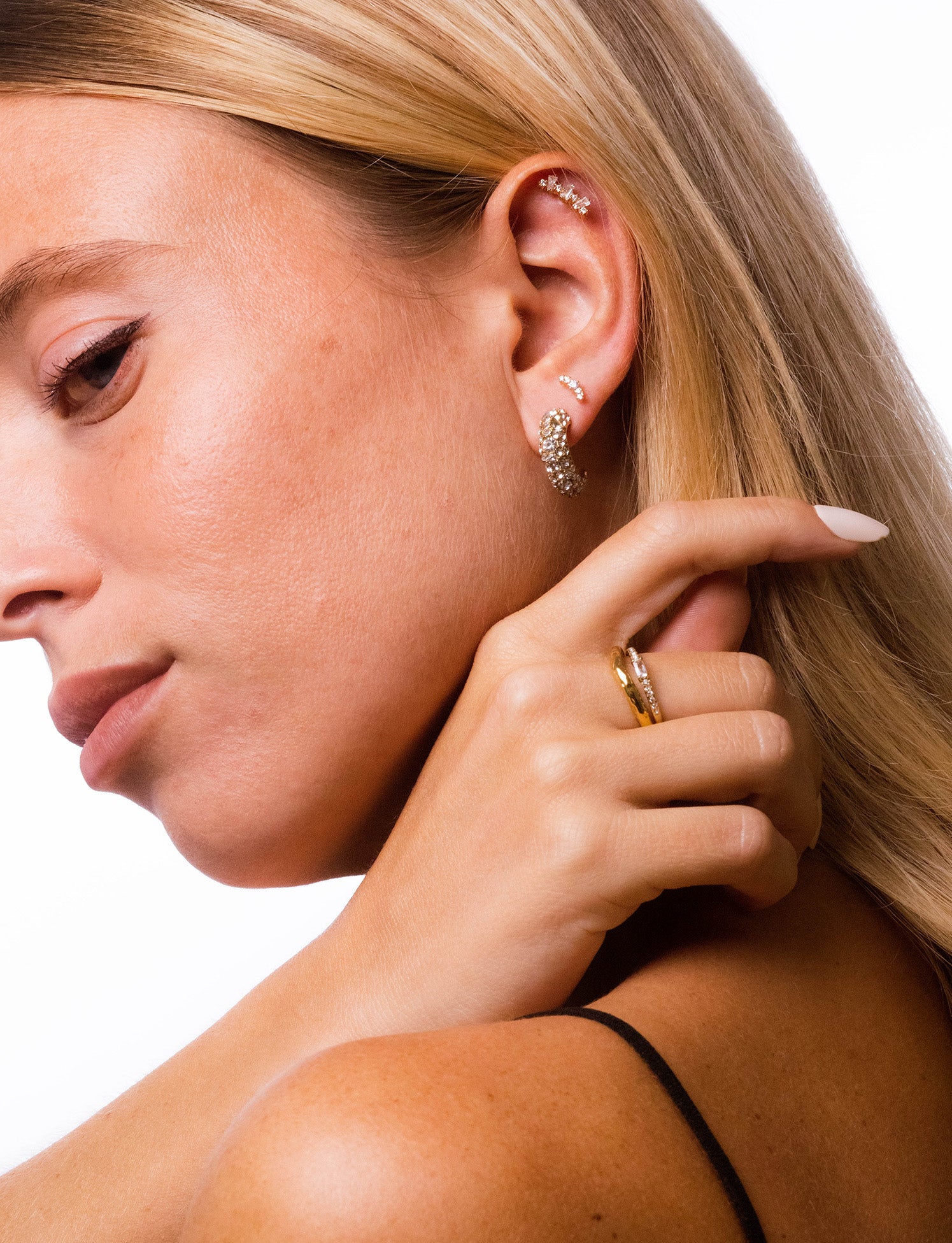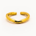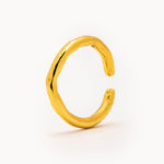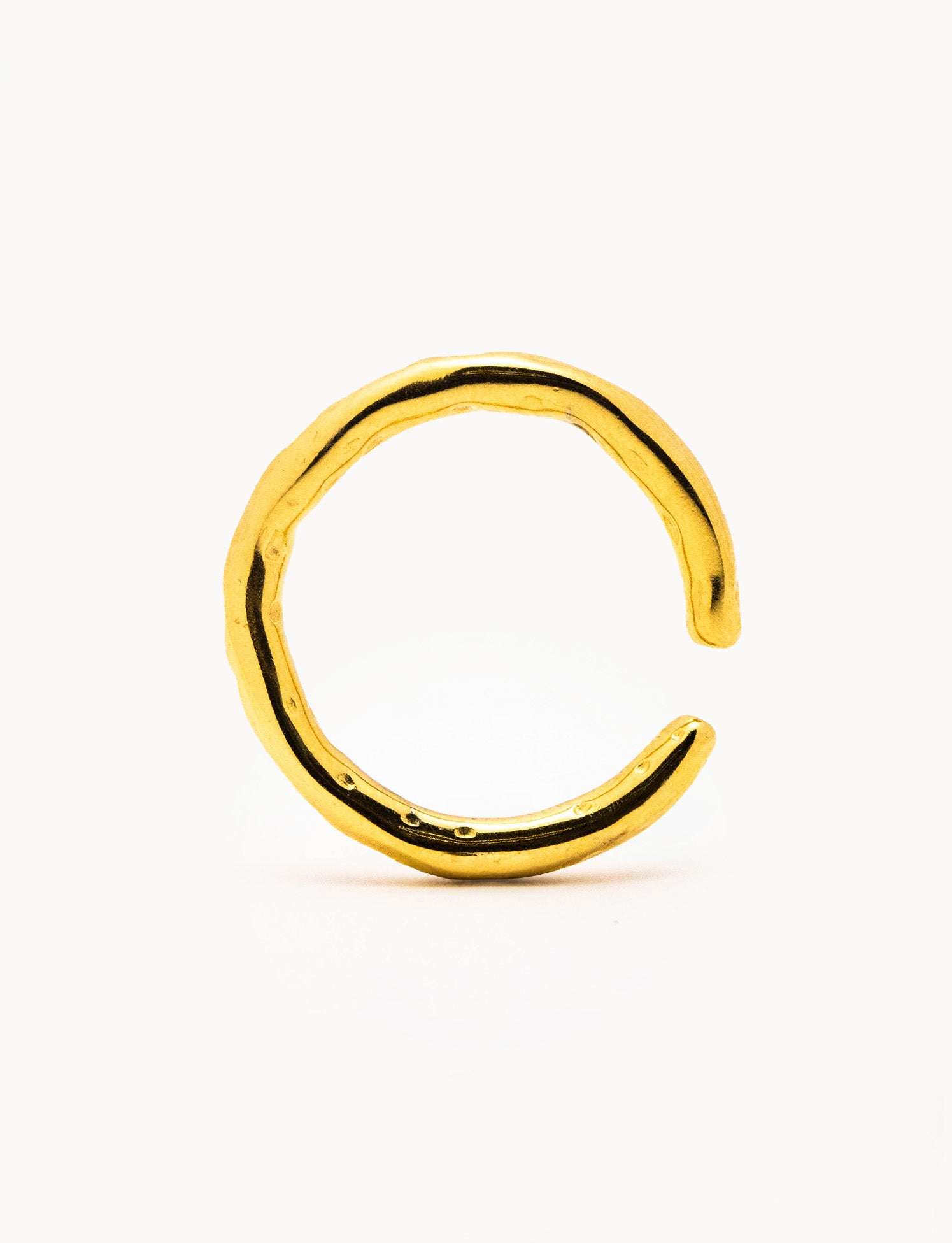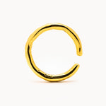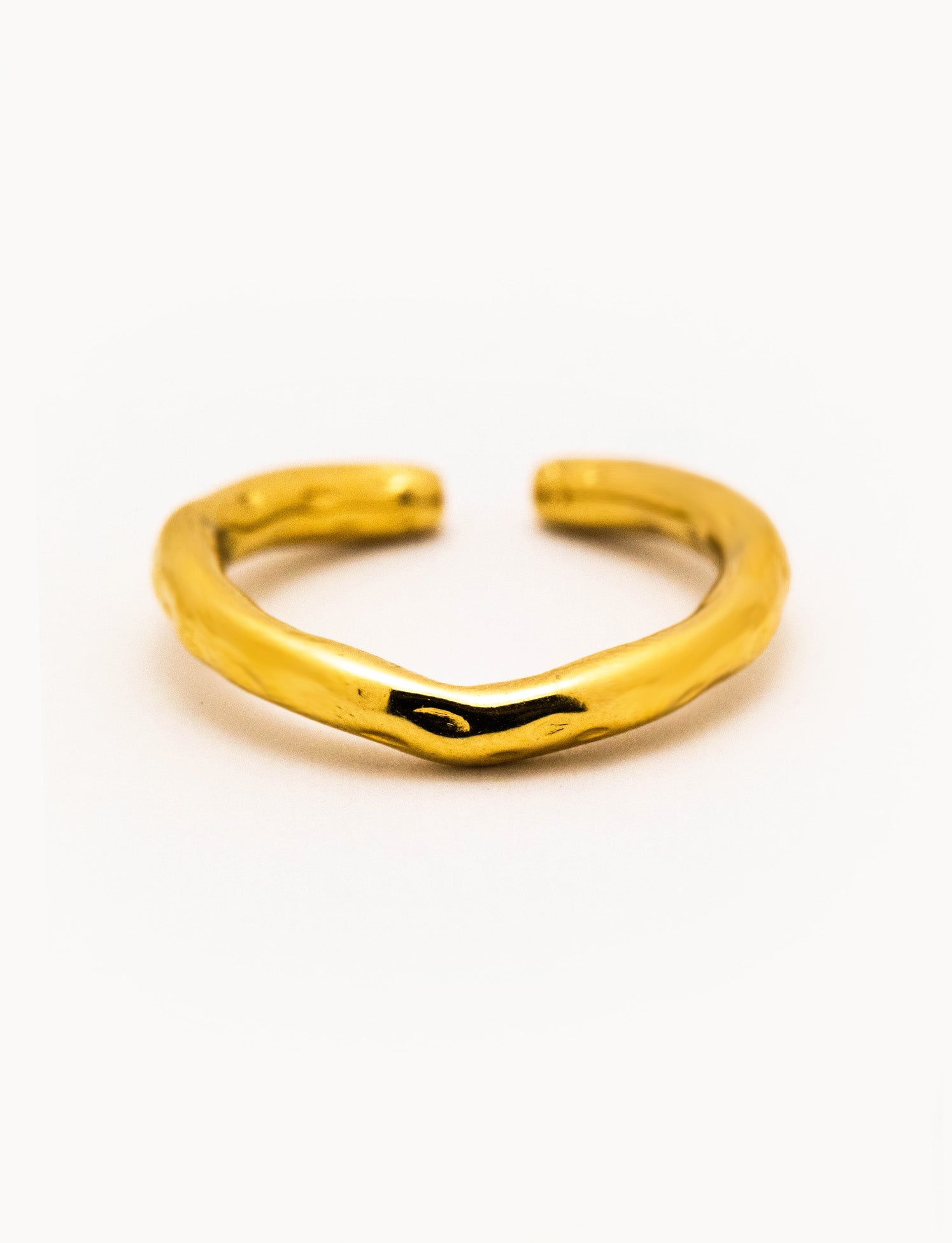 Anello in acciaio dorato caratterizzato da picchiettature e irregolari che avvolgono il dito con un design essenziale e moderno. La superficie lucida riflette la luce in modo elegante, creando un effetto dinamico. Un accessorio versatile, perfetto sia da solo sia in abbinamento ad altri anelli minimal.