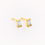 Orecchino a lobo minimalista in acciaio inossidabile con finitura dorata lucida, impreziosito da uno zircone trasparente taglio baguette montato a griffe. La pietra rettangolare, dalle linee nette e luminose, dona eleganza e raffinatezza pur mantenendo un design essenziale. Chiusura a perno con farfallina per una vestibilità sicura.