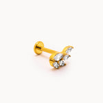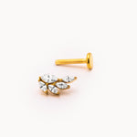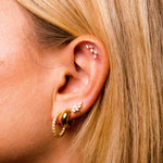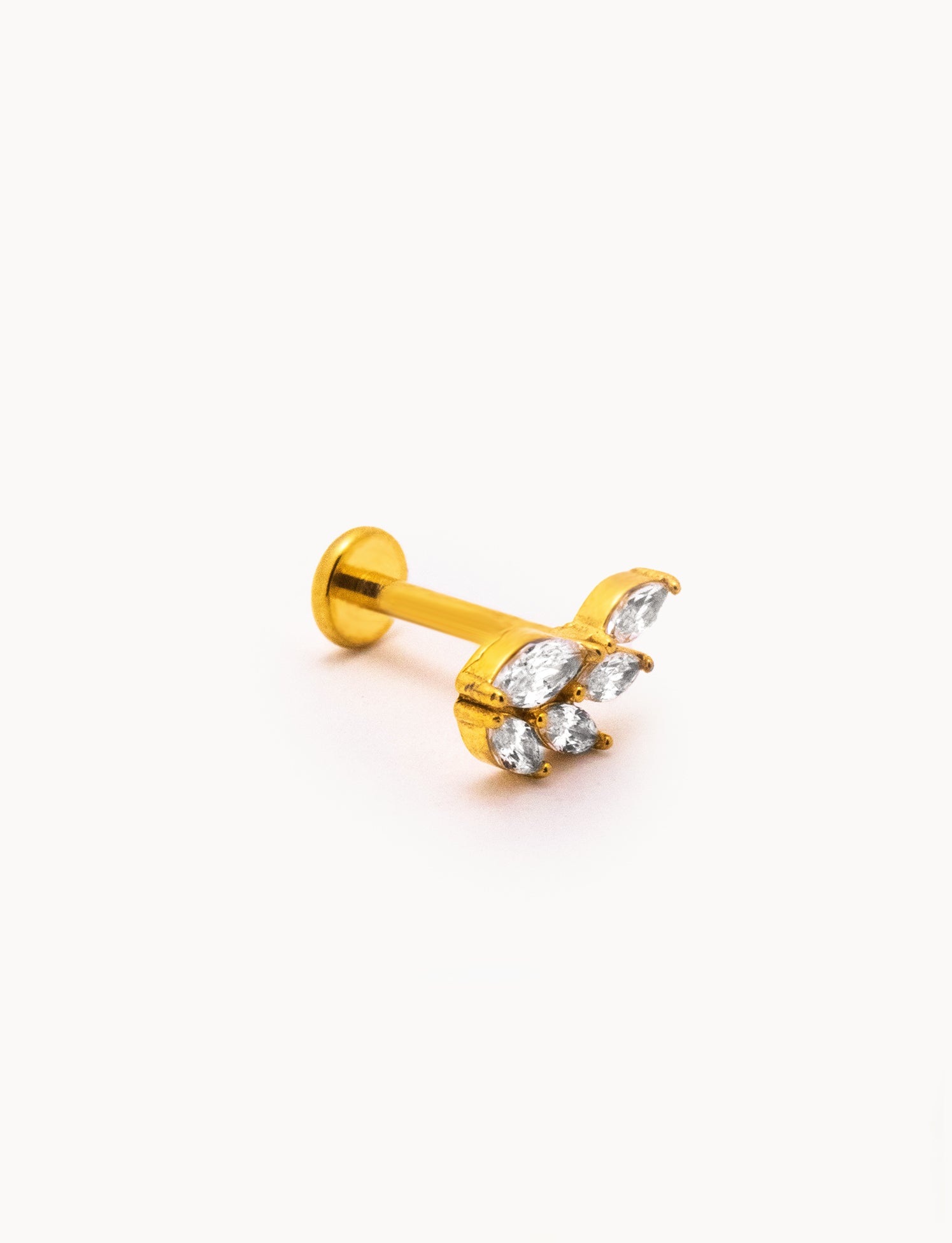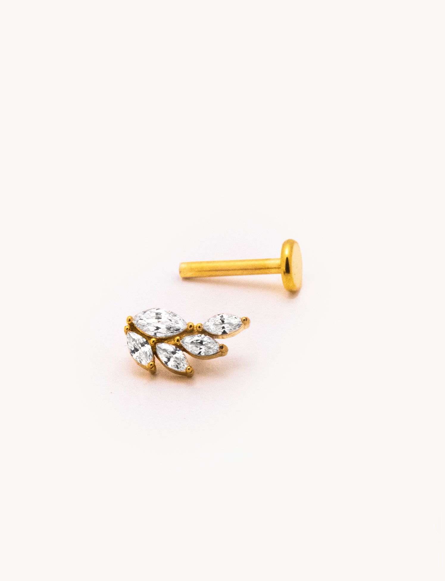 Piercing a forma di foglia, impreziosito da più zirconi trasparenti incastonati. Il design minimal ma luminoso lo rende ideale da indossare da solo per un dettaglio raffinato oppure in combinazione con altri orecchini per creare composizioni moderne e brillanti.