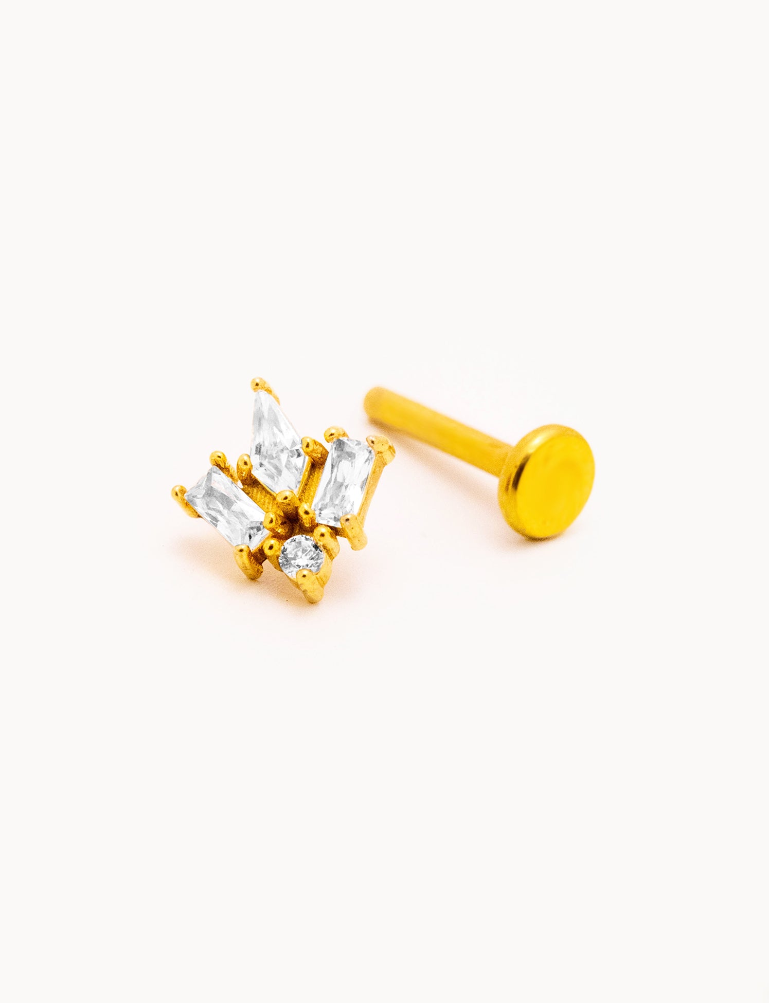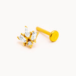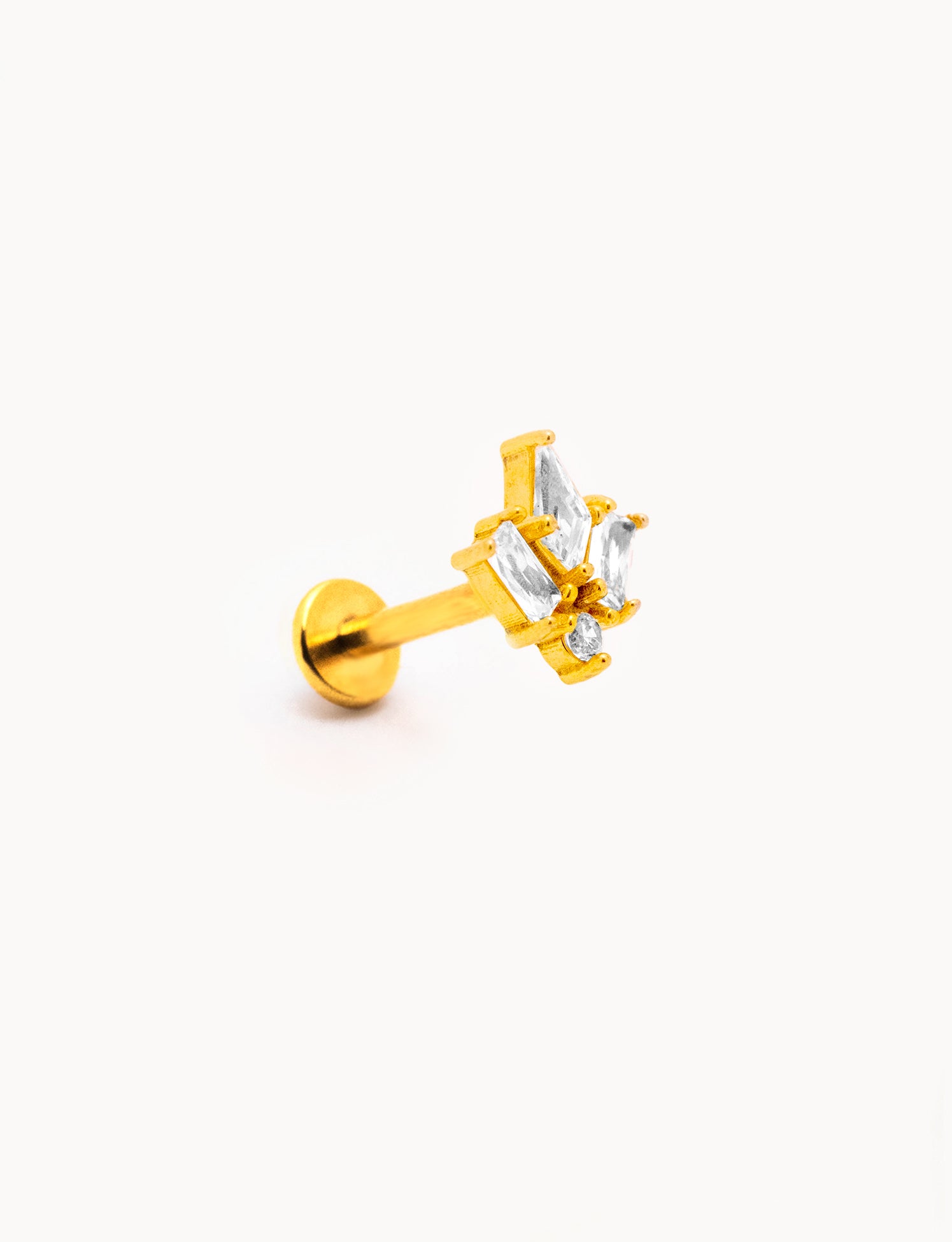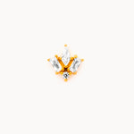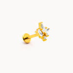 Piercing a barretta dritta in acciaio inossidabile con finitura dorata lucida, impreziosito da tre zirconi trasparenti taglio marquise disposti a formare un fiore di lotto stilizzato. La montatura rialzata permette alla luce di riflettere sulle pietre, esaltandone la brillantezza. Chiusura a vite piatta sul retro per un fissaggio stabile e confortevole.