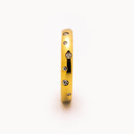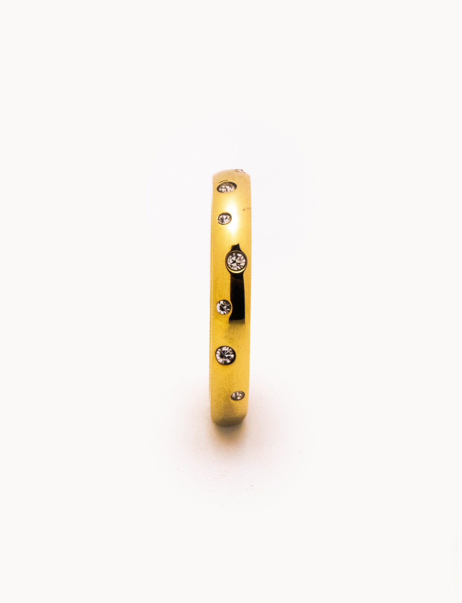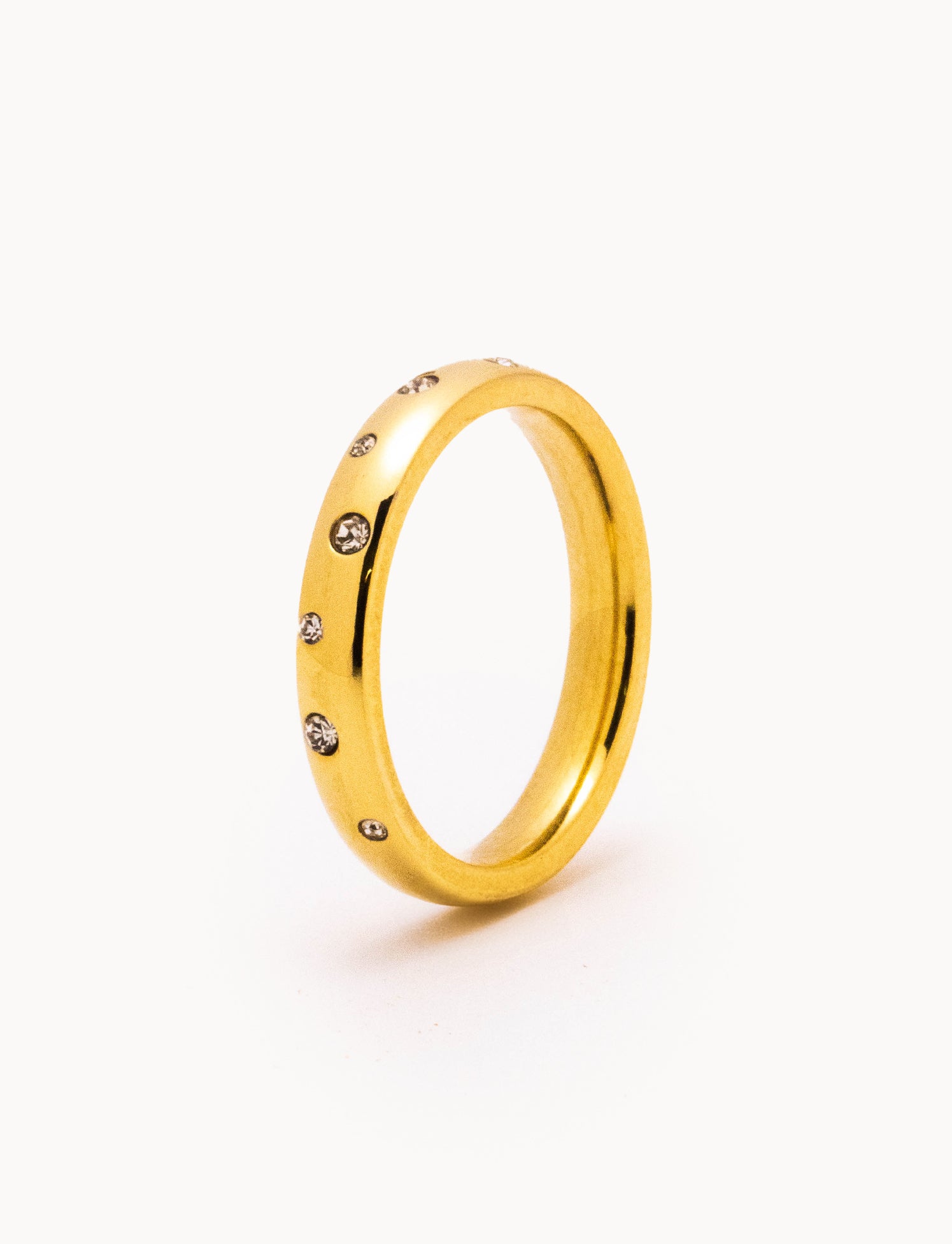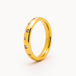 Anello in acciaio con struttura a fascia composta da una sequenza di piccoli zirconi alternati di diverse misure. Il profilo continuo donano un aspetto elegante ma raffinato.