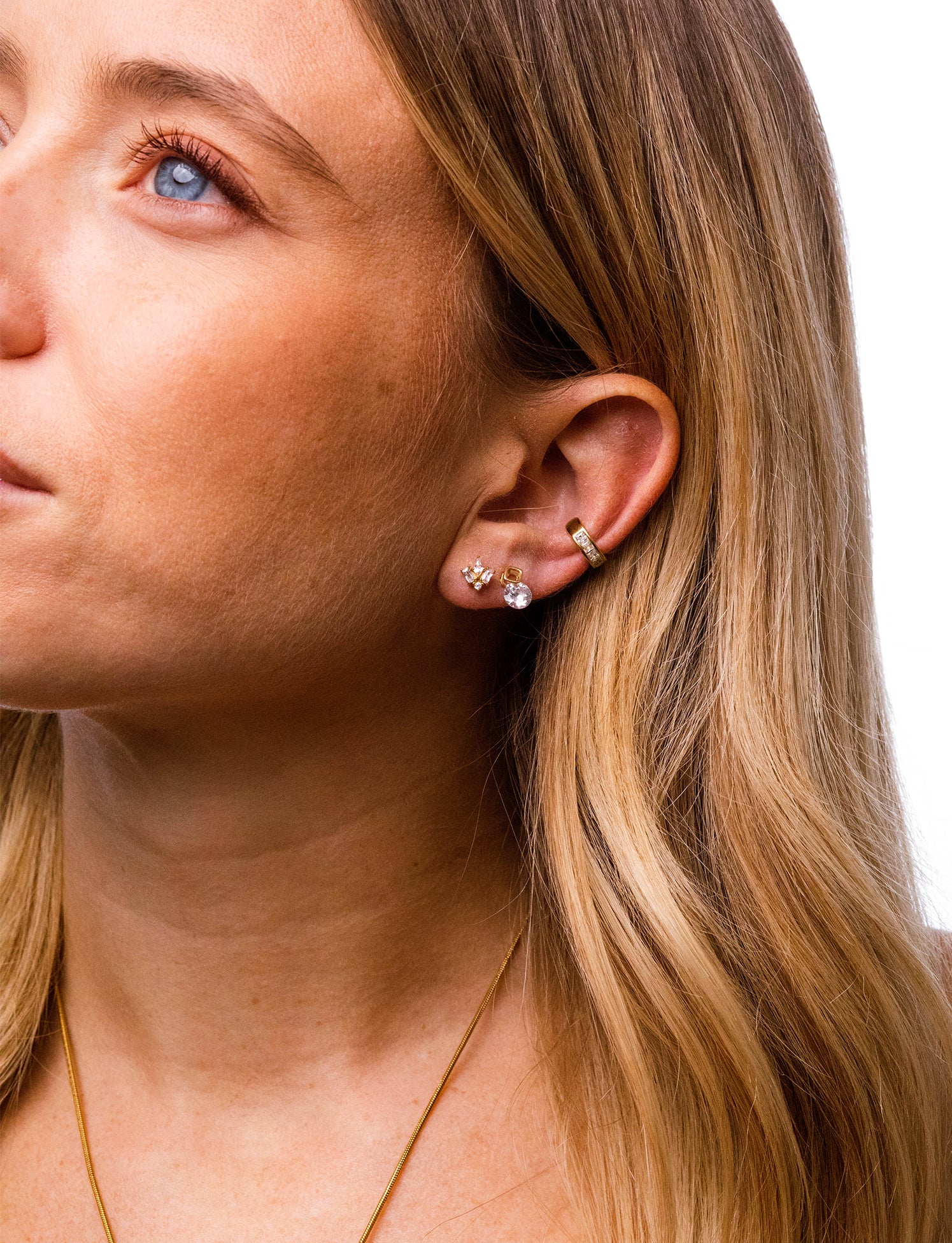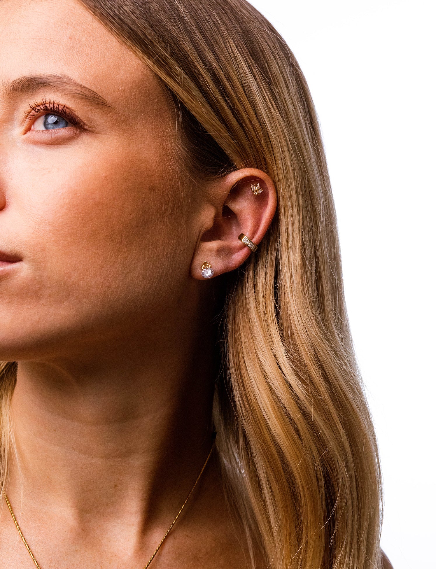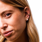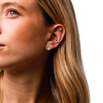 Orechino strutturato da una montatura in acciaio che supporta ma lascia libero di muoversi uno zircone taglio diamante.
