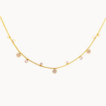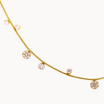 La composizione crea un gioco di riflessi grazie ai piccoli ciondoli zirconati mantenendo un design essenziale e versatile per l'uso quotidiano.