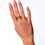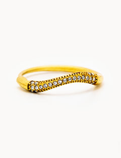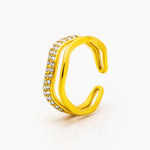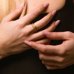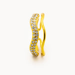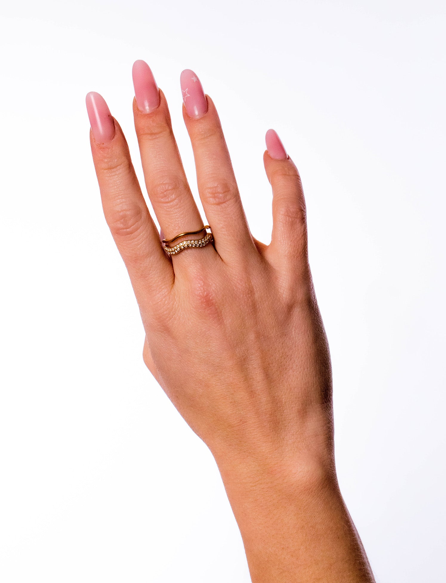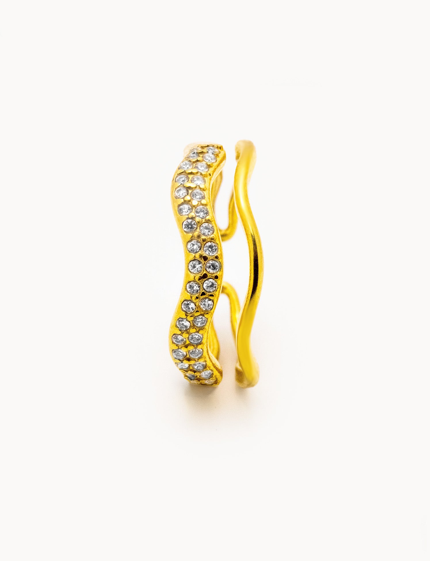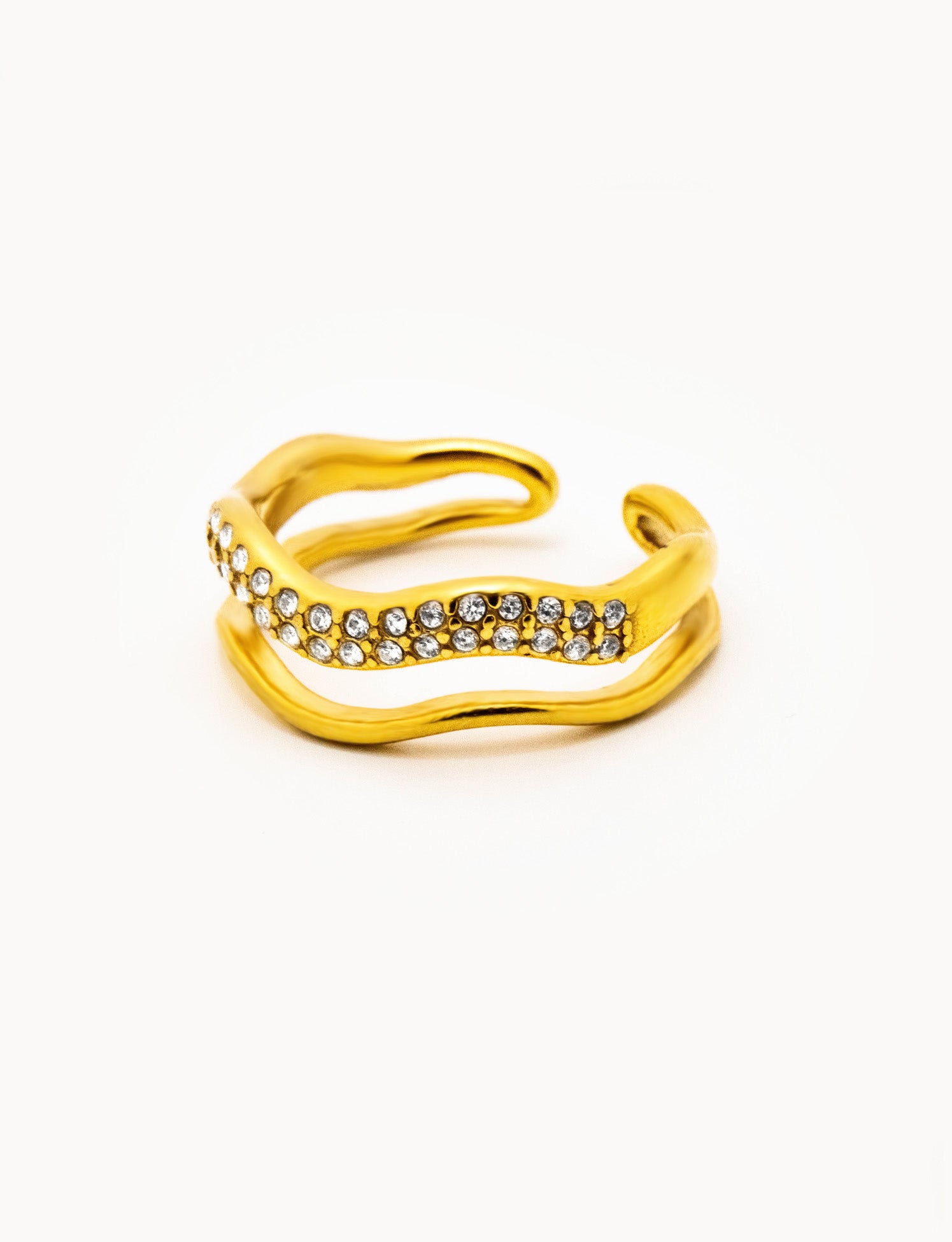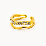 Anello in acciaio dorato caratterizzato da due linee sinuose e irregolari che avvolgono il dito con un design essenziale e moderno. La superficie lucida riflette la luce in modo elegante, creando un effetto dinamico che richiama le forme fluide della natura, il tutto accompagnato da una seconda linea tempestata di zirconi. Un accessorio versatile, perfetto sia da solo sia in abbinamento ad altri anelli minimali.