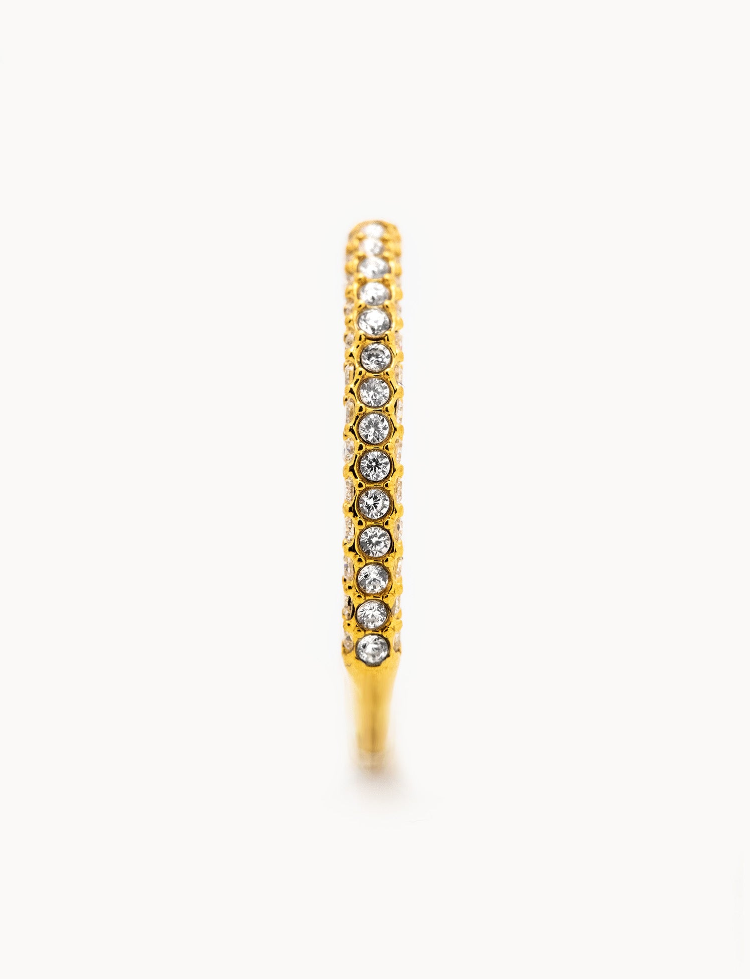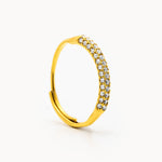 Anello in acciaio dorato con struttura a fascia composta da una sequenza di piccoli zirconi. Il profilo continuo dona un aspetto elegante ma raffinato.