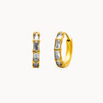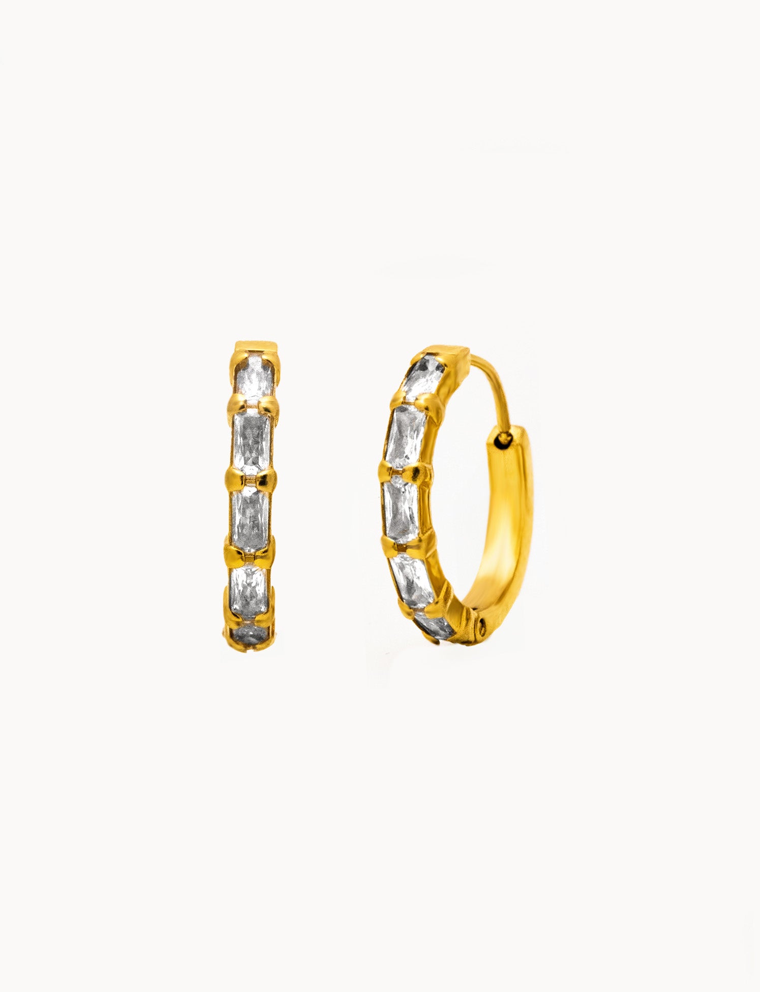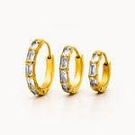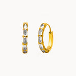 Orecchini a Cerchio dalla forma che richiama il bamboo e zirconata a forma di baguette, realizzati in acciaio inox dorato con finitura lucida. La silhouette compatta e morbida dona un effetto moderno e deciso, rendendoli un accessorio versatile da indossare ogni giorno o per occasioni speciali.