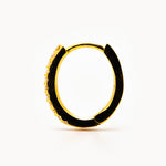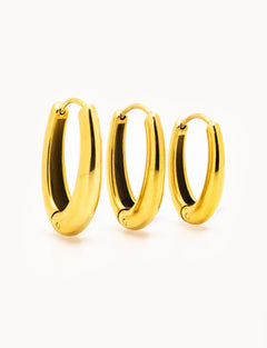 Orecchini a Ovale dalla forma fine e brillantinata, realizzati in acciaio inox con finitura dorata lucida. La silhouette compatta e morbida dona un effetto moderno e deciso, rendendoli un accessorio versatile da indossare ogni giorno o per occasioni speciali.
