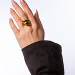 Anello in acciaio dorato con struttura a fascia fluida composta da uno zircone taglio ovale nel movimento fluido dell'anello. Il profilo continuo dona un aspetto elegante ma raffinato.