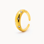 Anello bombato in acciaio dorato con finitura lucida, impreziosito da piccoli cristalli incastonati a stella. La forma tondeggiante e avvolgente dona volume alla mano, mentre le incisioni effetto "galassia" con pietre luminose creano un raffinato gioco di luce e movimento. Un pezzo bold ma armonioso, perfetto da indossare da solo o abbinato.