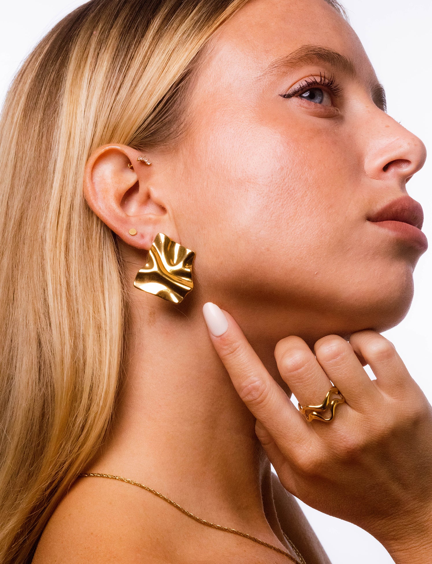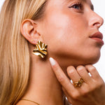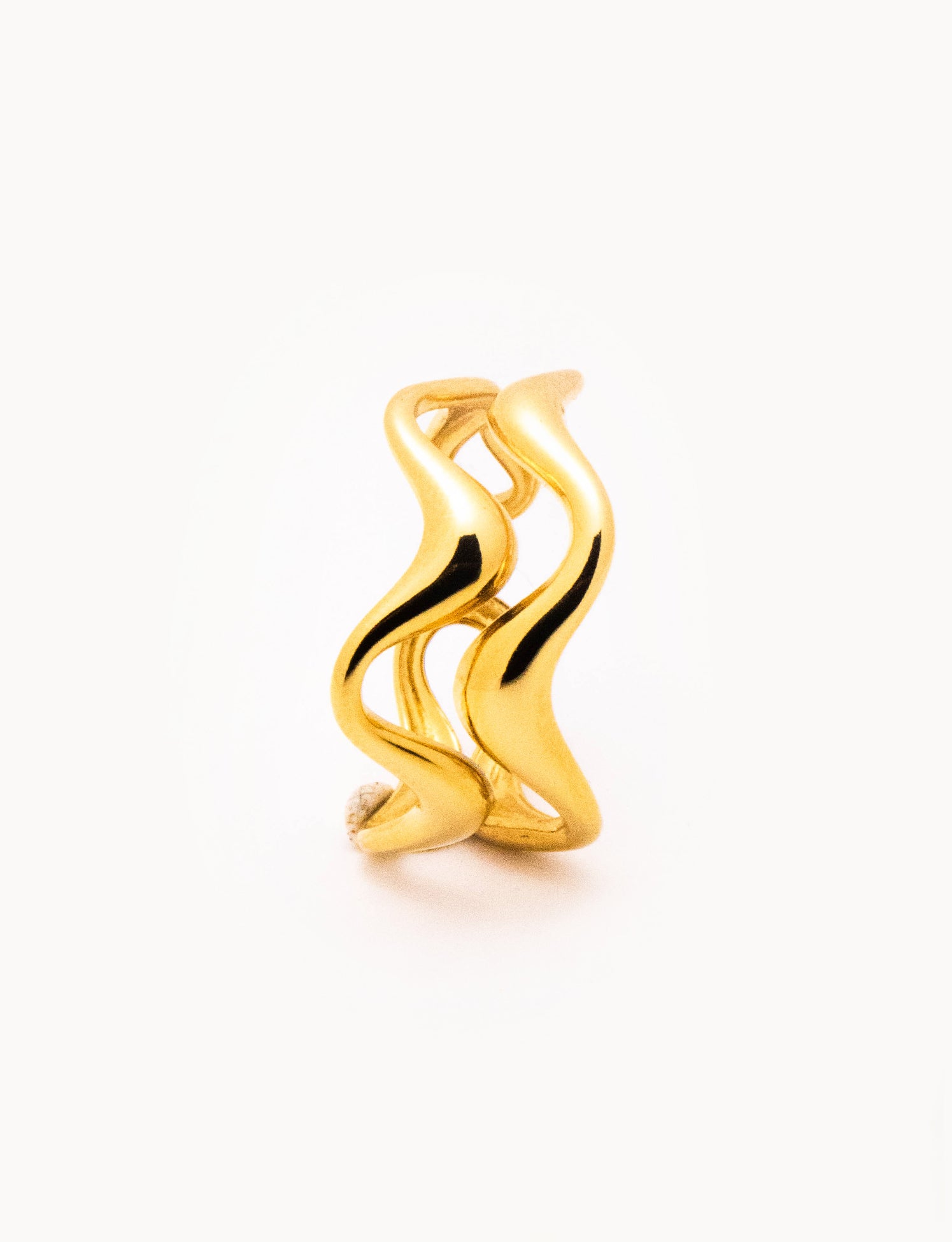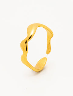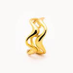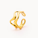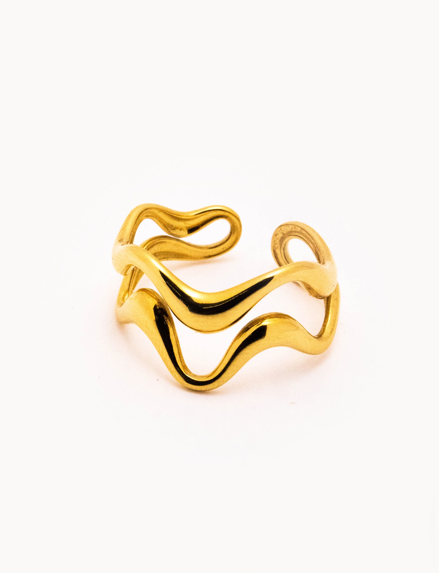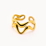 Anello in acciaio dorato caratterizzato da due linee sinuose e irregolari che avvolgono il dito con un design essenziale e moderno. La superficie lucida riflette la luce in modo elegante, creando un effetto dinamico che richiama le forme fluide della natura. Un accessorio versatile, perfetto sia da solo sia in abbinamento ad altri anelli minimal.