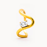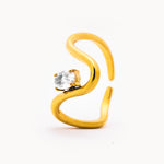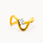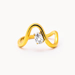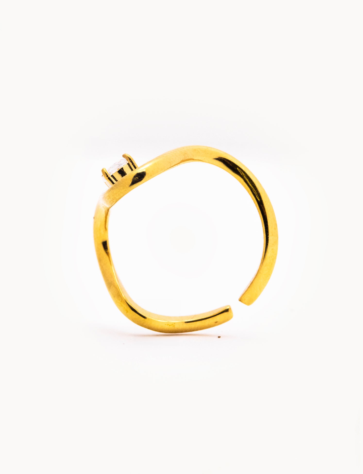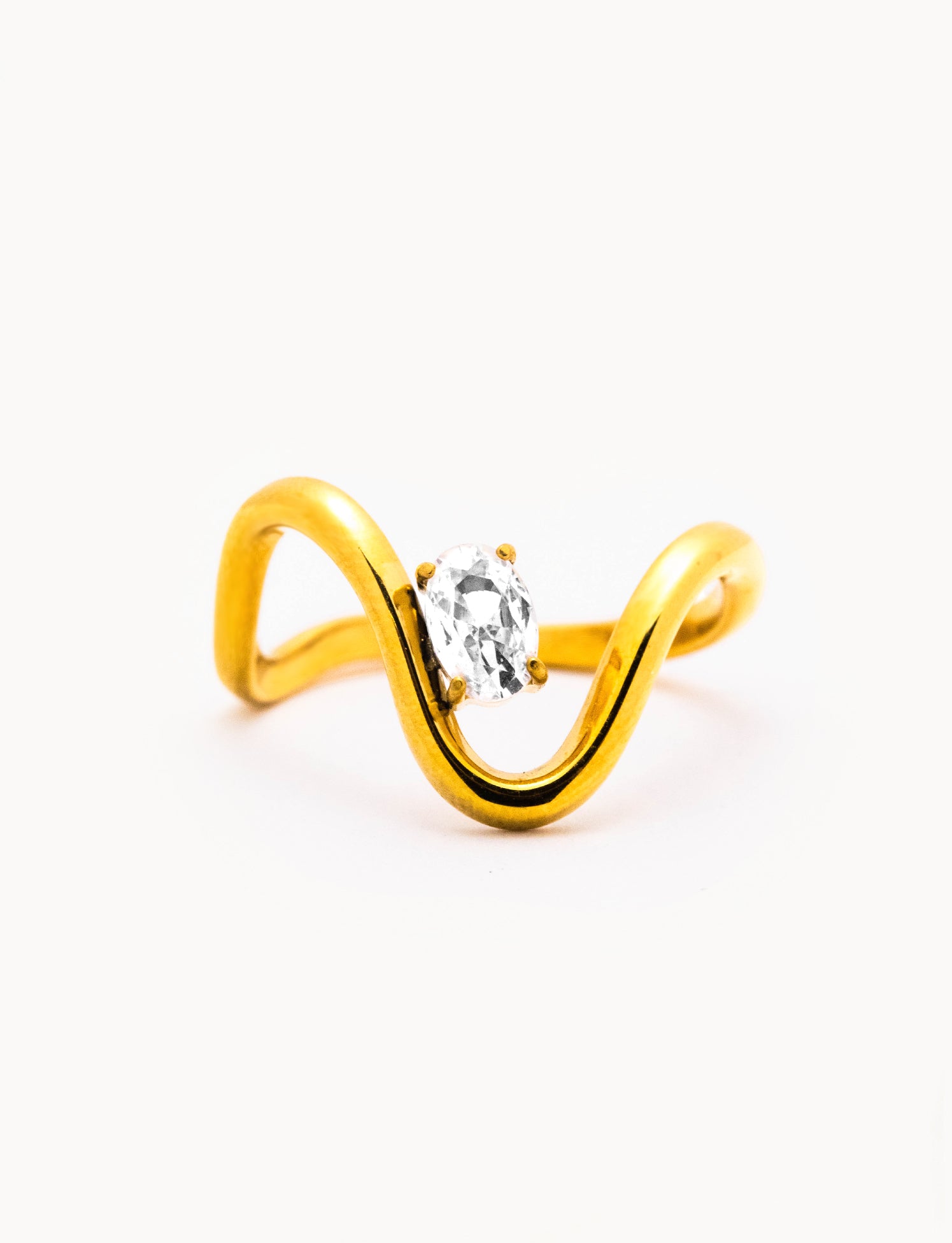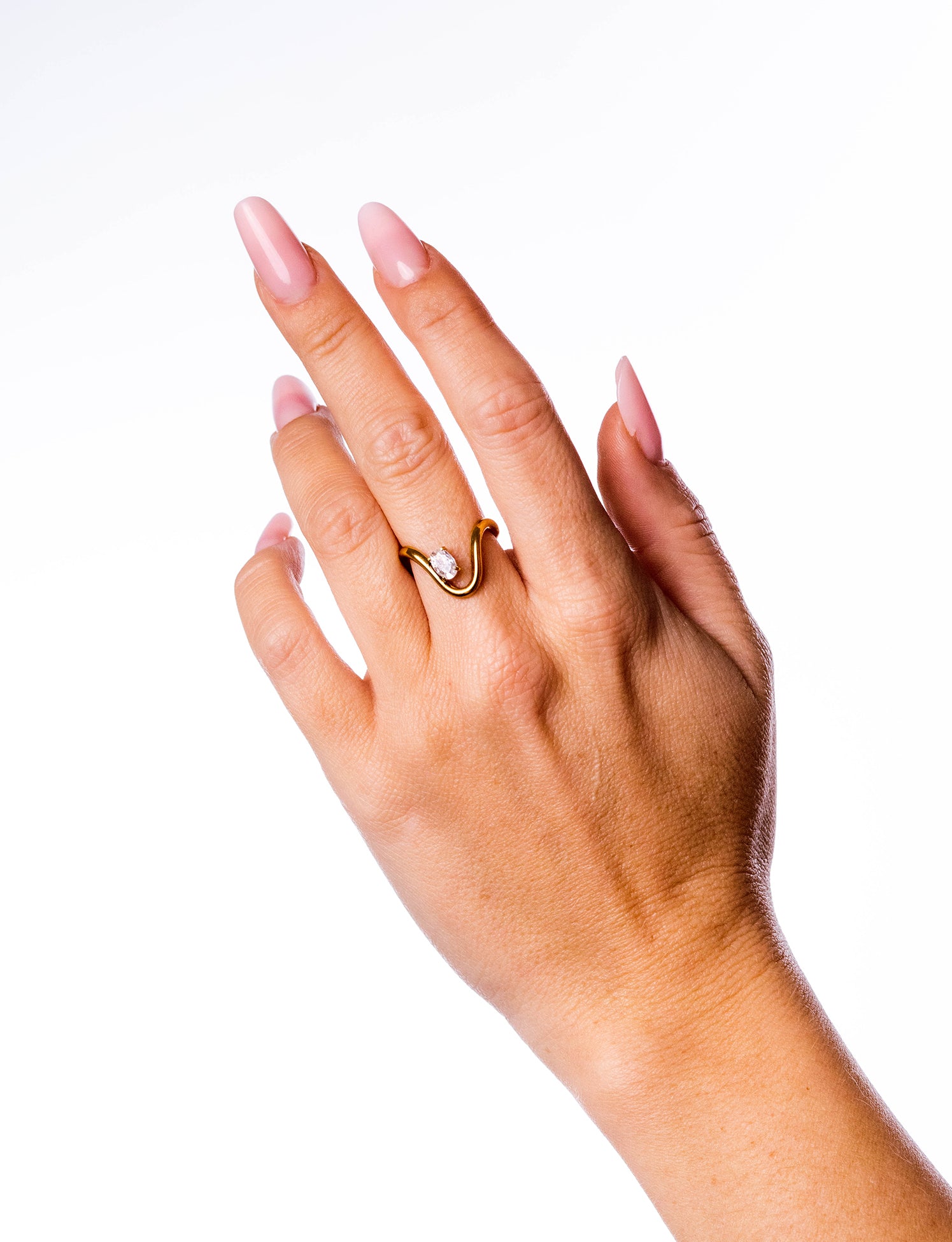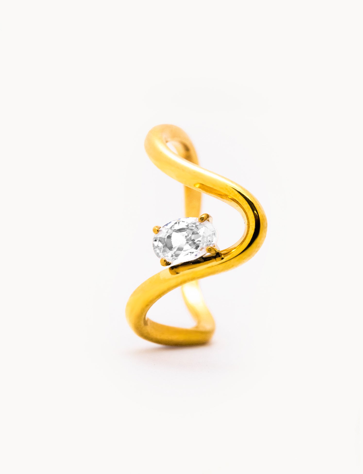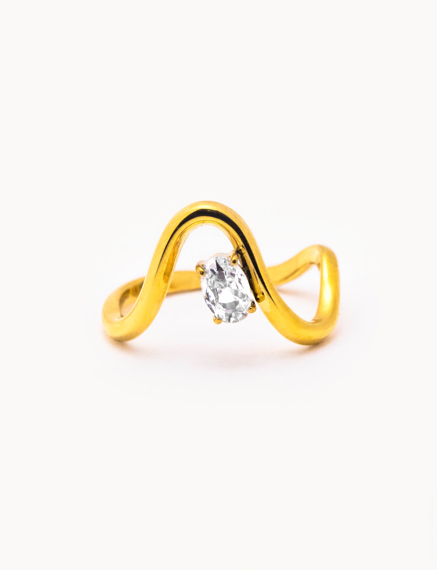 Anello in acciaio dorato con struttura a fascia fluida composta da uno zircone taglio ovale nel movimento fluido dell'anello. Il profilo continuo dona un aspetto elegante ma raffinato.