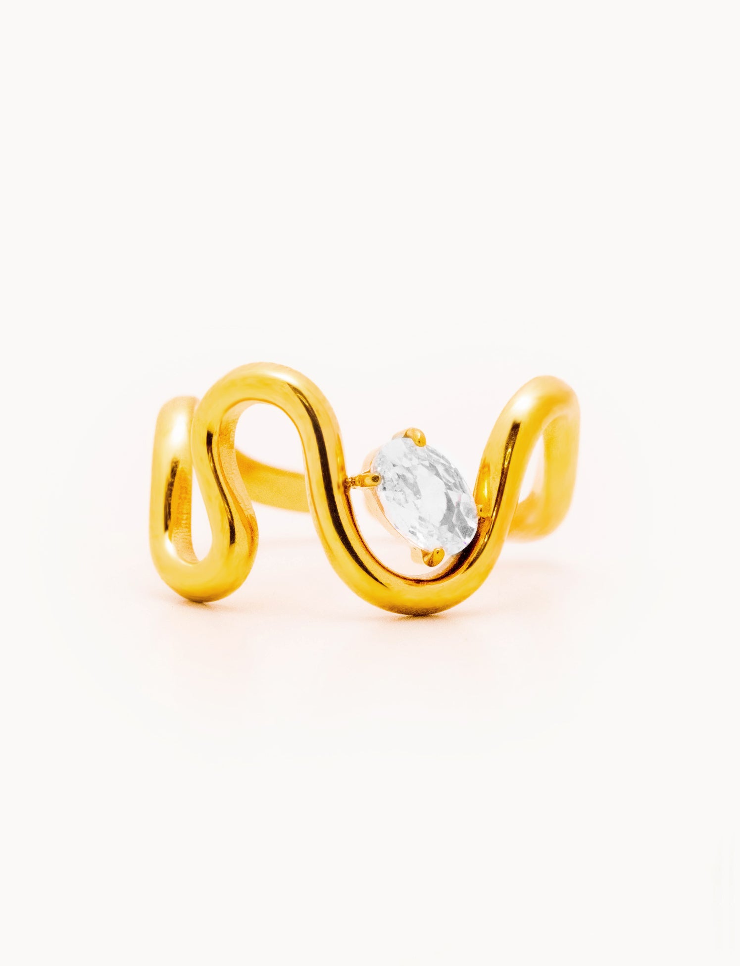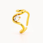 Anello in acciaio dorato con struttura a fascia fluida composta da uno zircone taglio ovale nel movimento fluido dell'anello. Il profilo continuo dona un aspetto elegante ma raffinato.