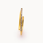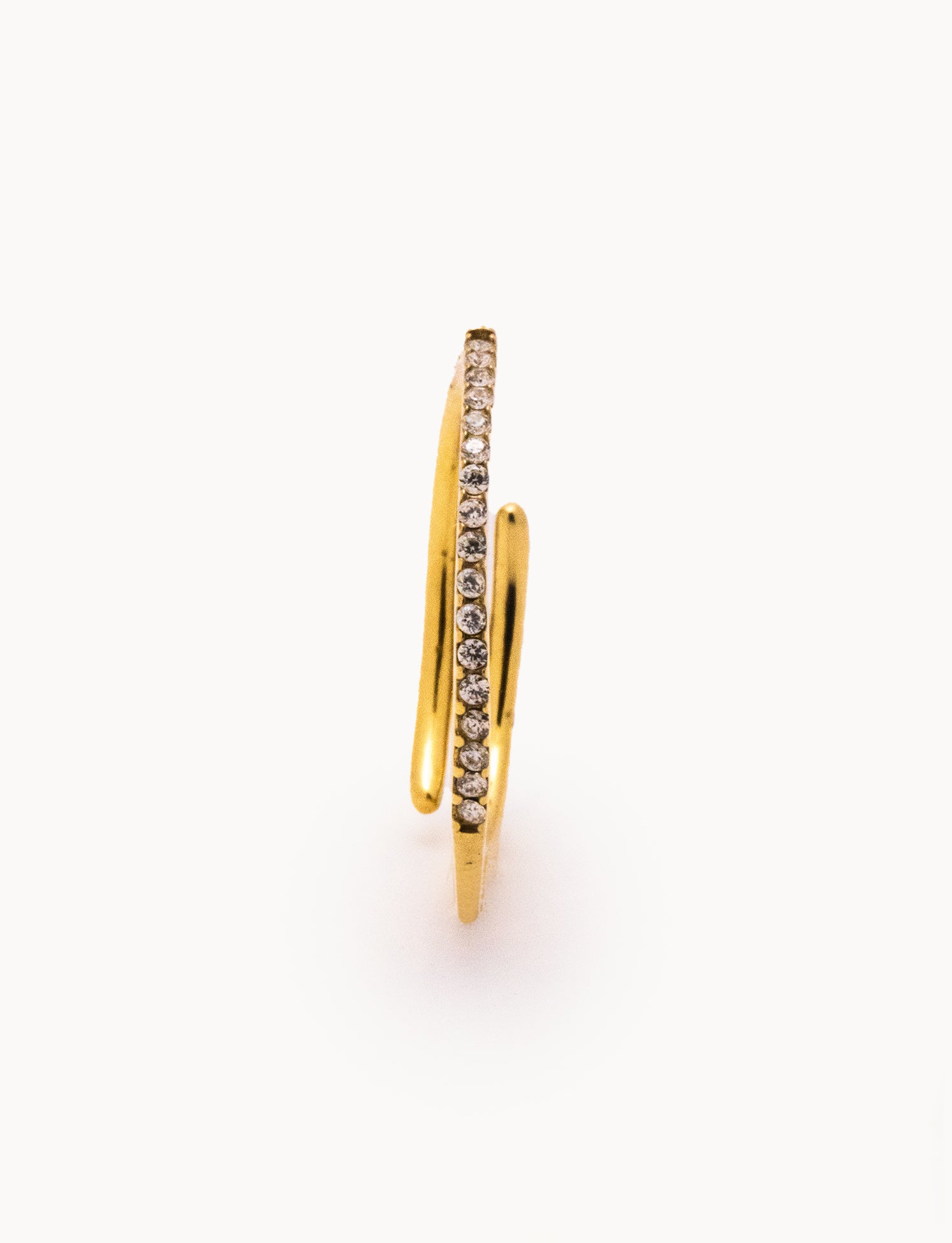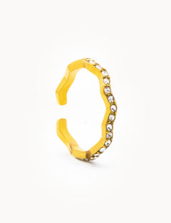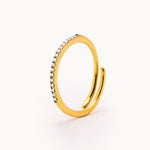 Anello in acciaio dorato con struttura a fascia composta da una sequenza di piccoli zirconi. Il profilo continuo donano un aspetto elegante ma raffinato.