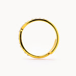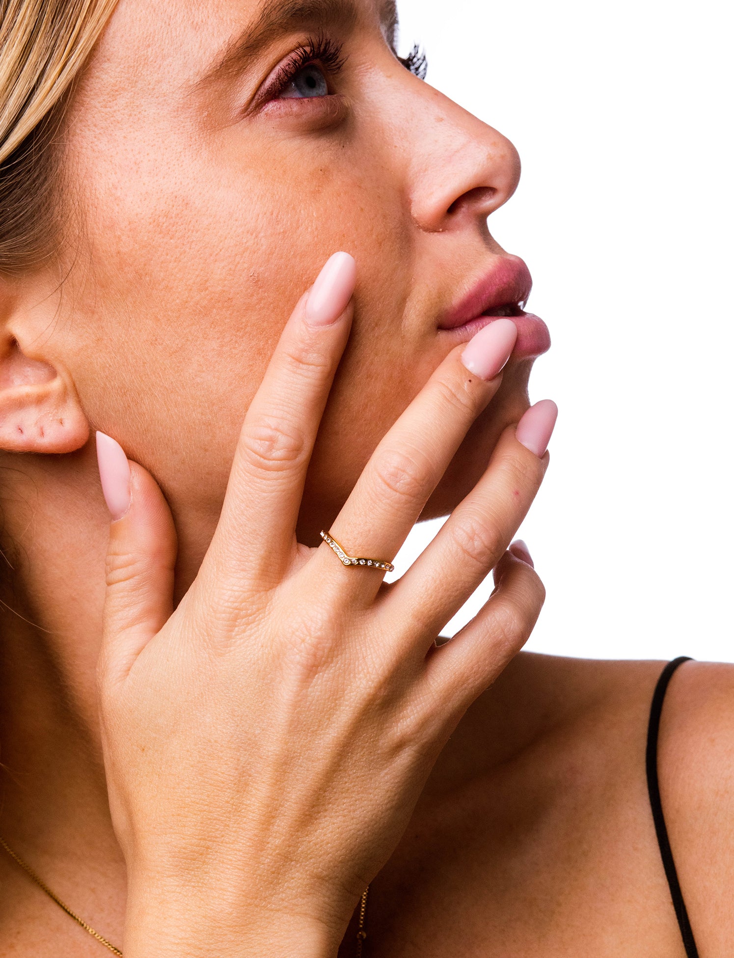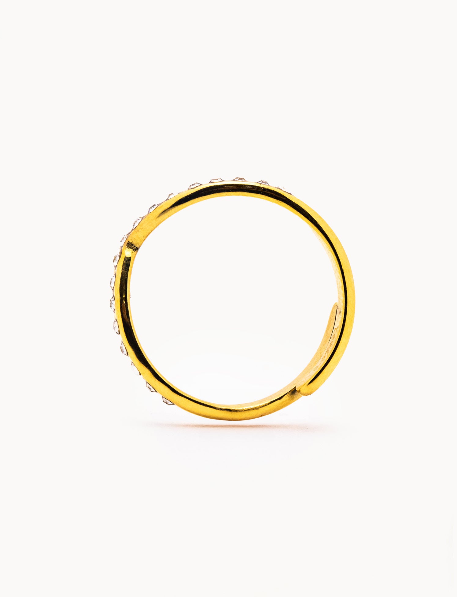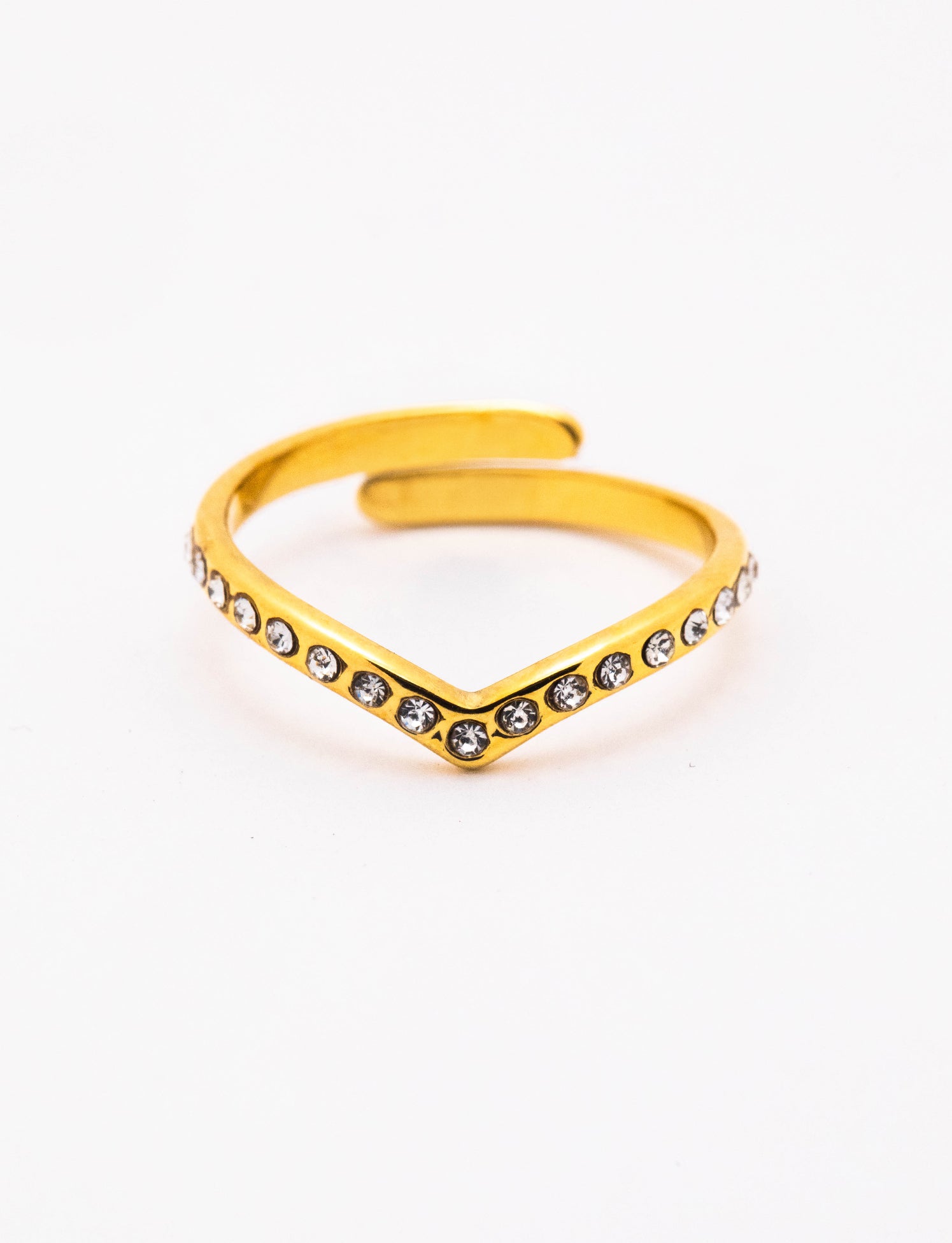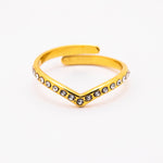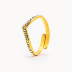 Anello in acciaio dorato con struttura a fascia composta da una sequenza di piccoli zirconi che crea una V. Il profilo continuo dona un aspetto elegante ma raffinato.