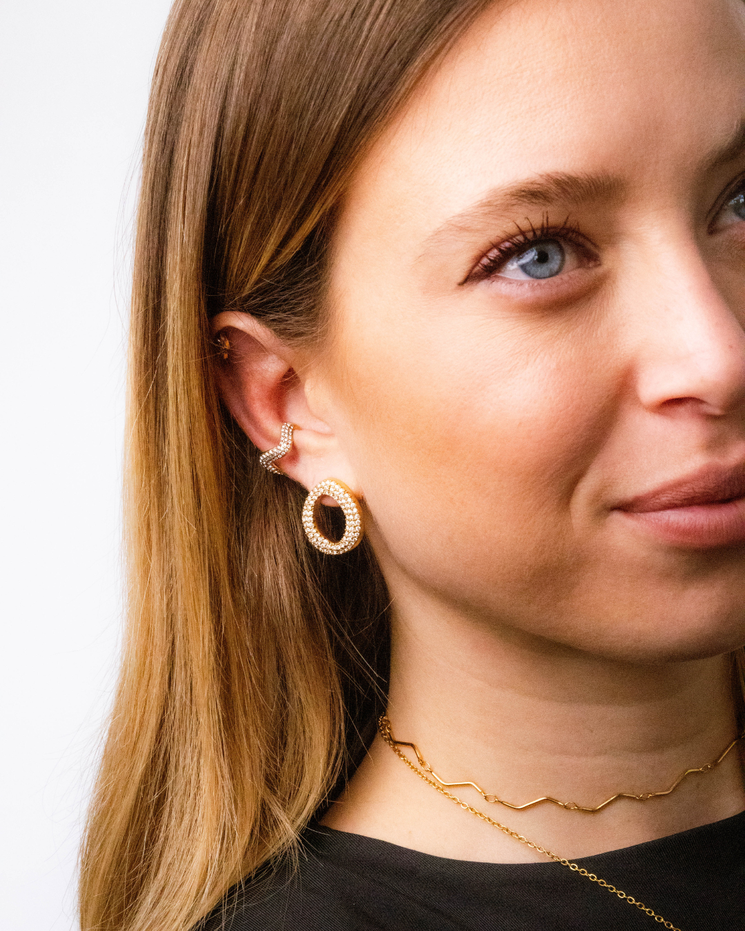 Si indossa senza foro, avvolgendo delicatamente l'orecchio, ed è perfetto per aggiungere un tocco glamour e moderno al look, sia da solo he abbinato ad altri orecchini.