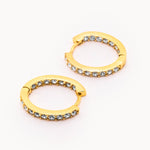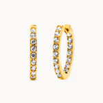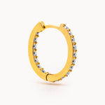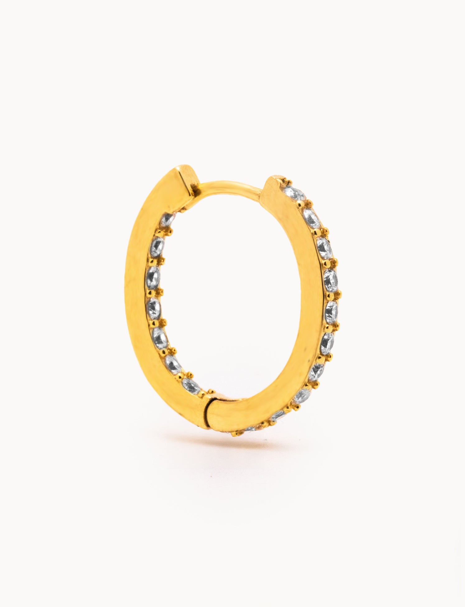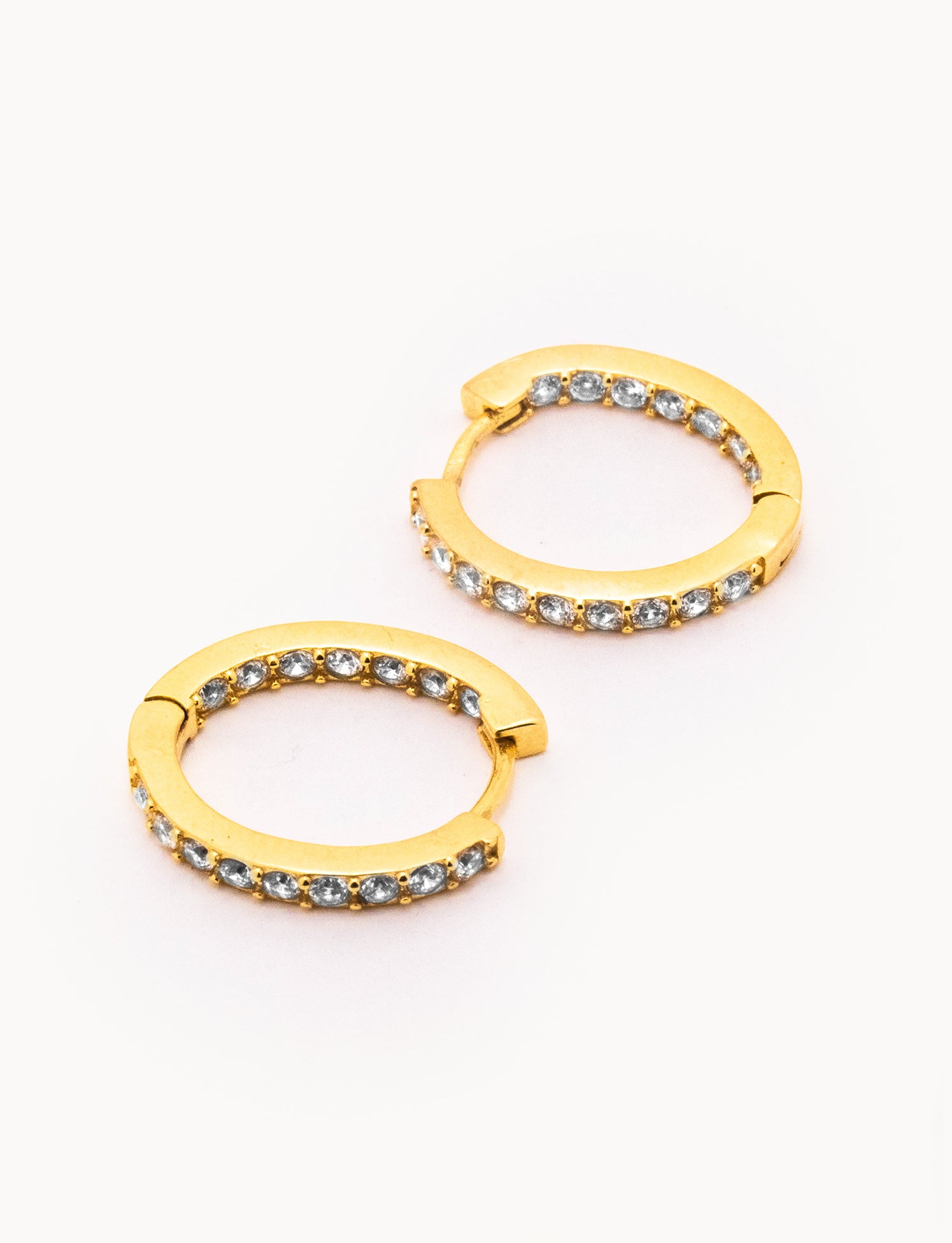 Coppia di orecchini in acciaio inossidabile a cerchio con piccoli zirconi incastonati sia nella parte frontale dell'orecchino che nella parte interna della parte retro.