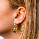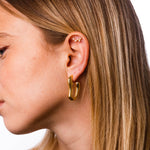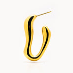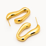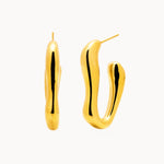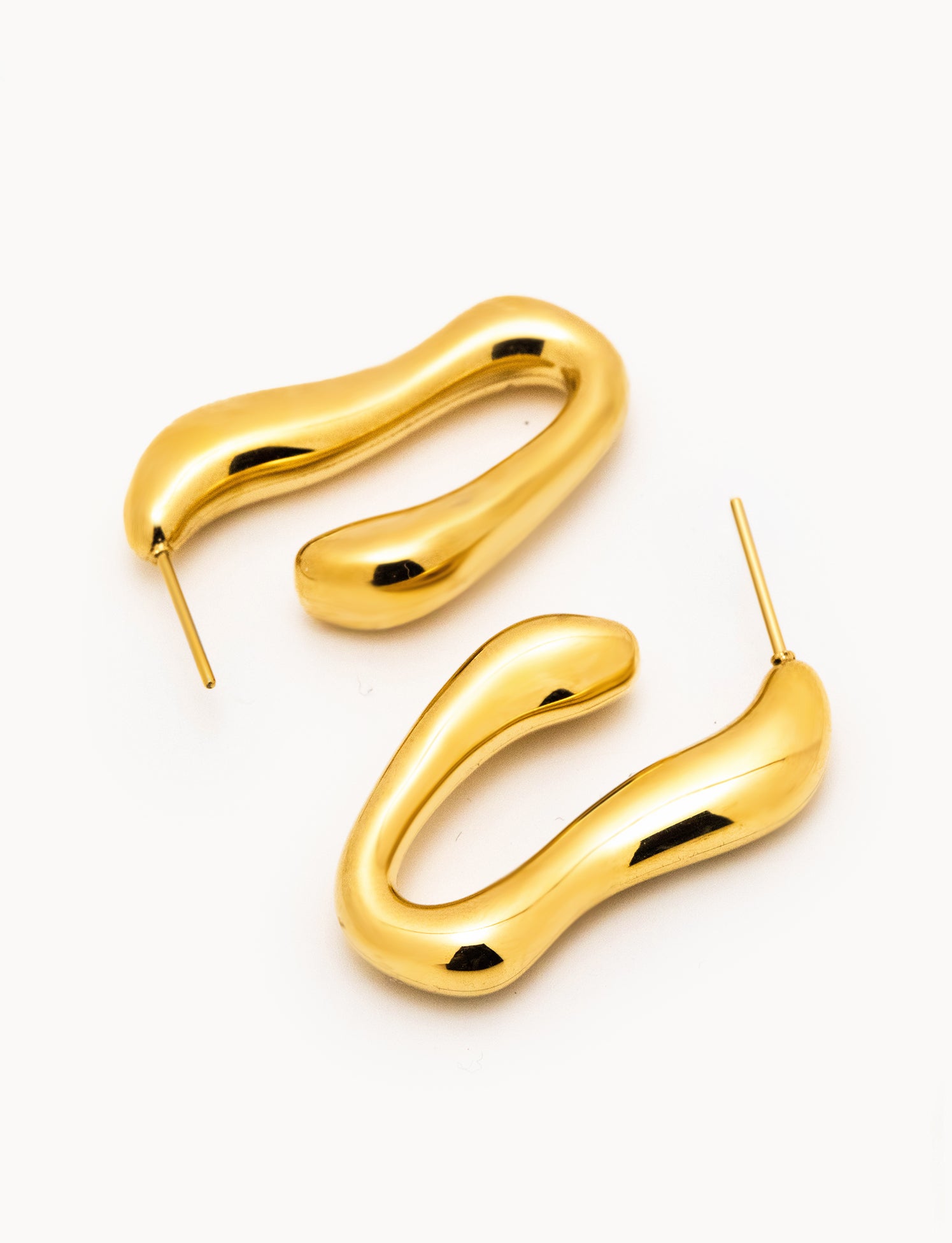 Orecchini a cerchio dal profilo irregolare e ondulato, realizzati in acciaio inox con finitura dorata lucida. La forma morbida e asimmetrica crea un effetto fluido e contemporaneo, valorizzando il volume e la superficie liscia del metallo.