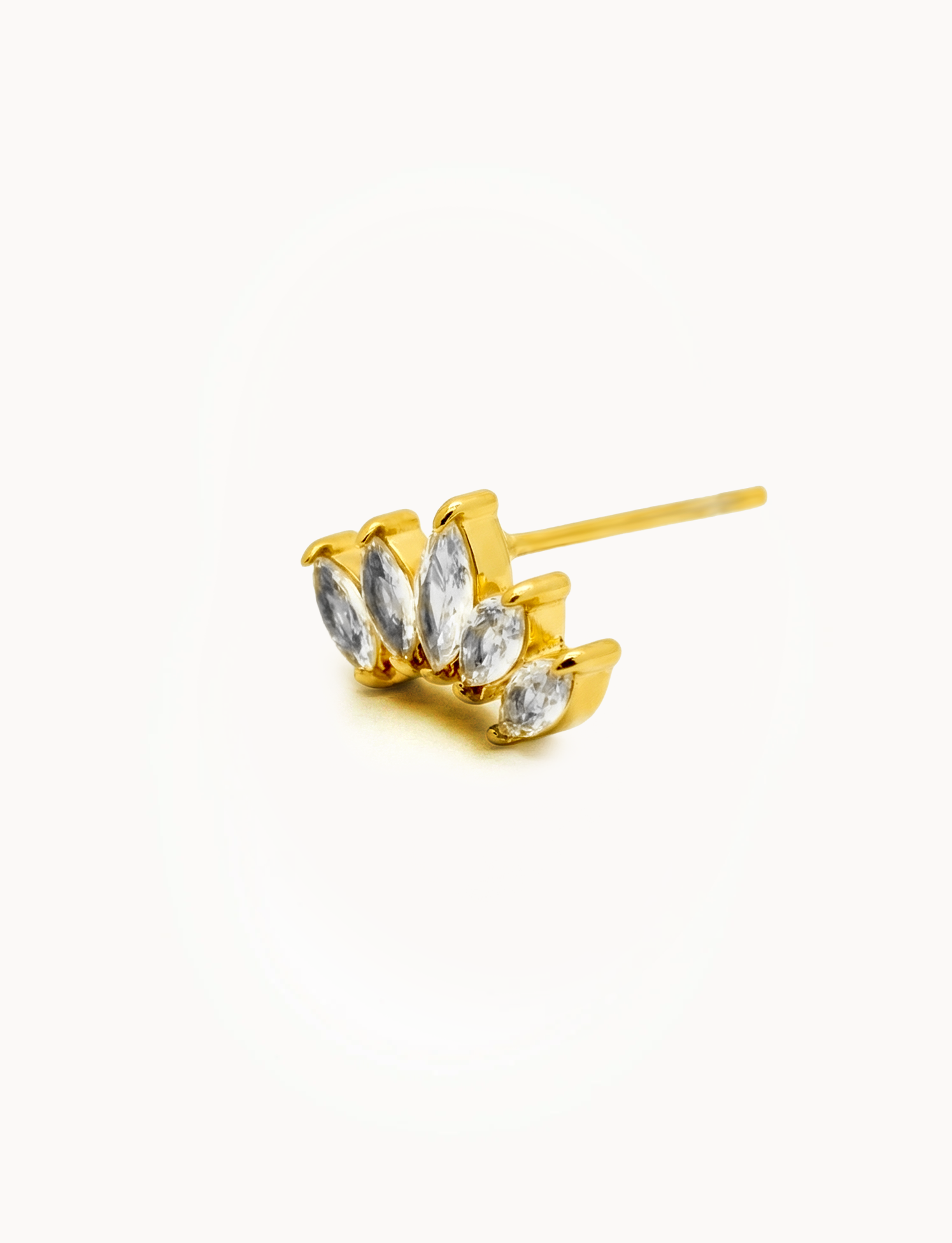 Orecchini in acciaio inox con zirconi taglio marquise disposti a forma di corona, che creano un elegante effetto luminoso e delicato. Il design leggermente curvo segue la linea del lobo, donando raffinatezza e un tocco naturale al look.