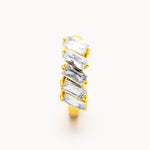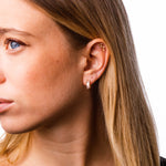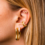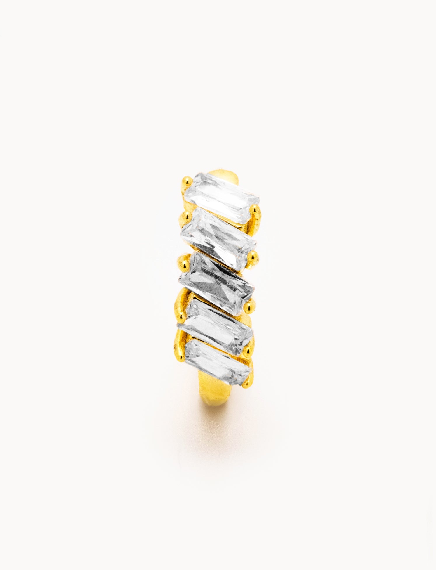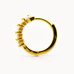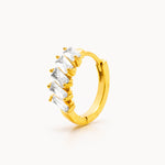 Orecchino a cerchio realizzato in acciaio inox con finitura dorata lucida, impreziosito da una fila frontale di zirconi trasparenti dal taglio rettangolare. Le pietre sono incastonate singolarmente, creando un effetto luminoso ordinato e lineare.