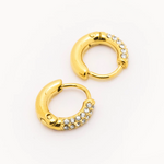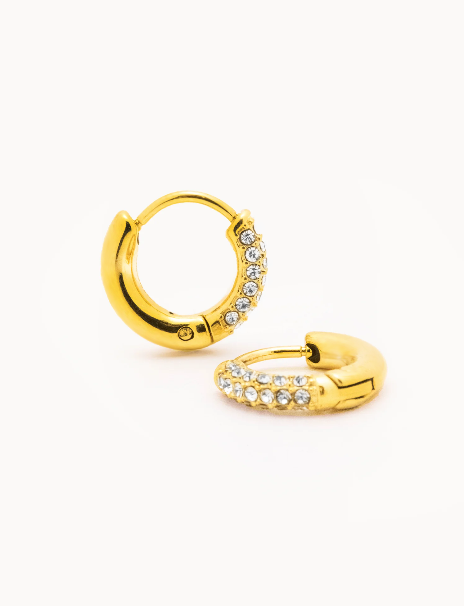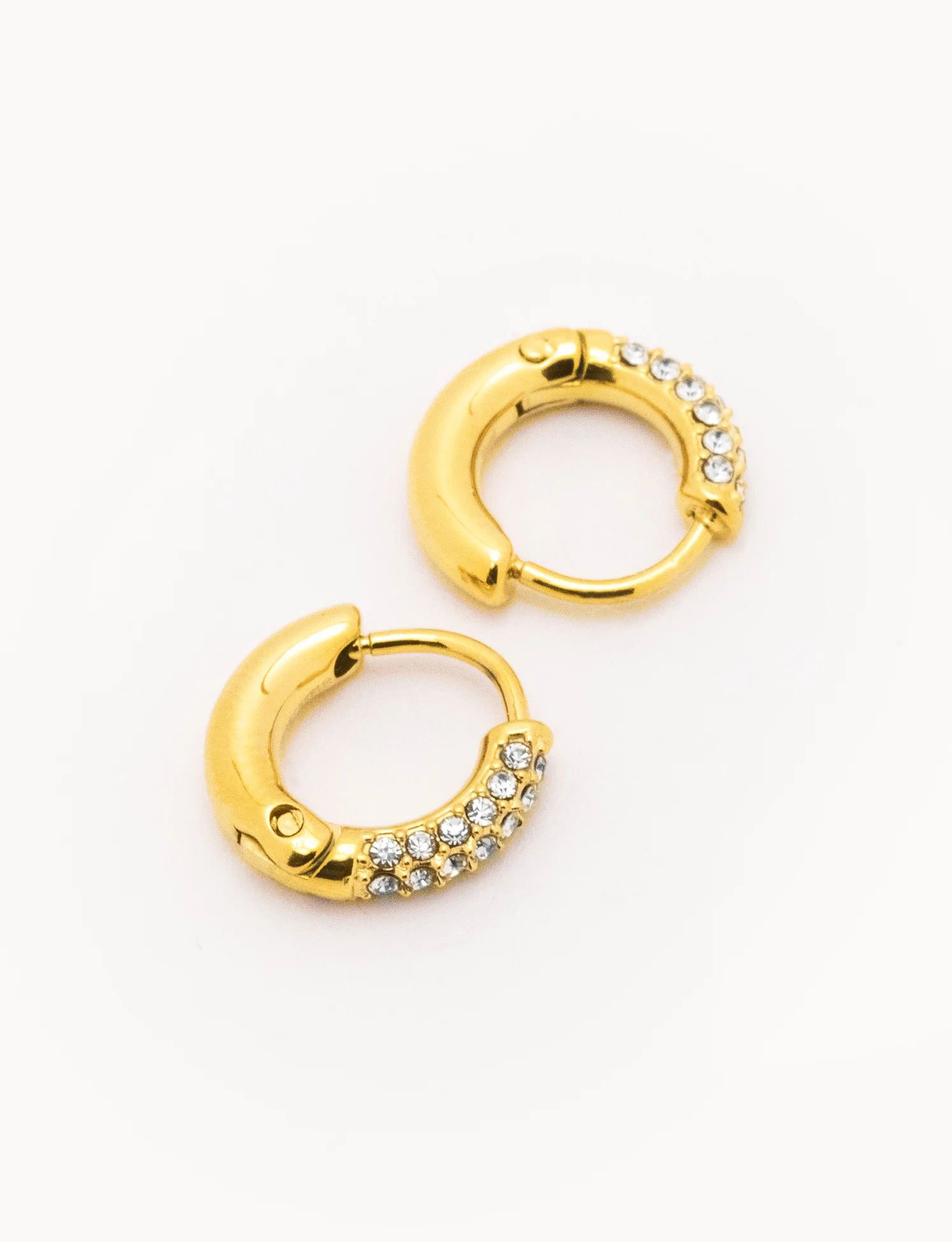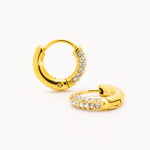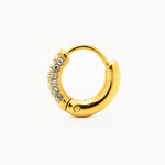 Orecchino a cerchio in acciaio inox dorato, impreziosito da una fila di zirconi trasparenti incastonati a pavé sulla parte frontale. Il design compatto e luminoso lo rende ideale per essere indossato da solo oppure abbinato ad altri orecchini per creare combinazioni personalizzate. Venduto singolarmente.