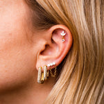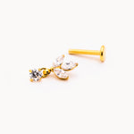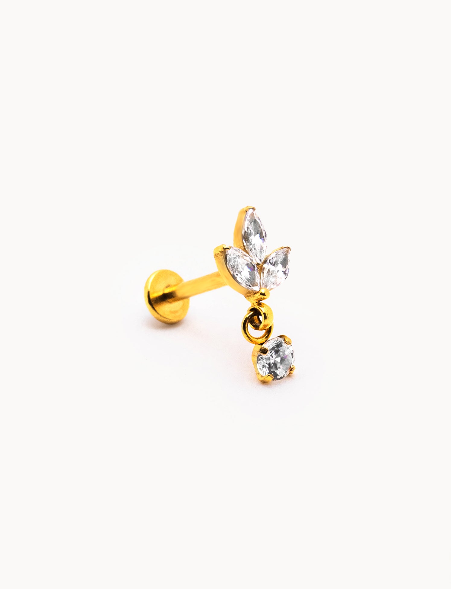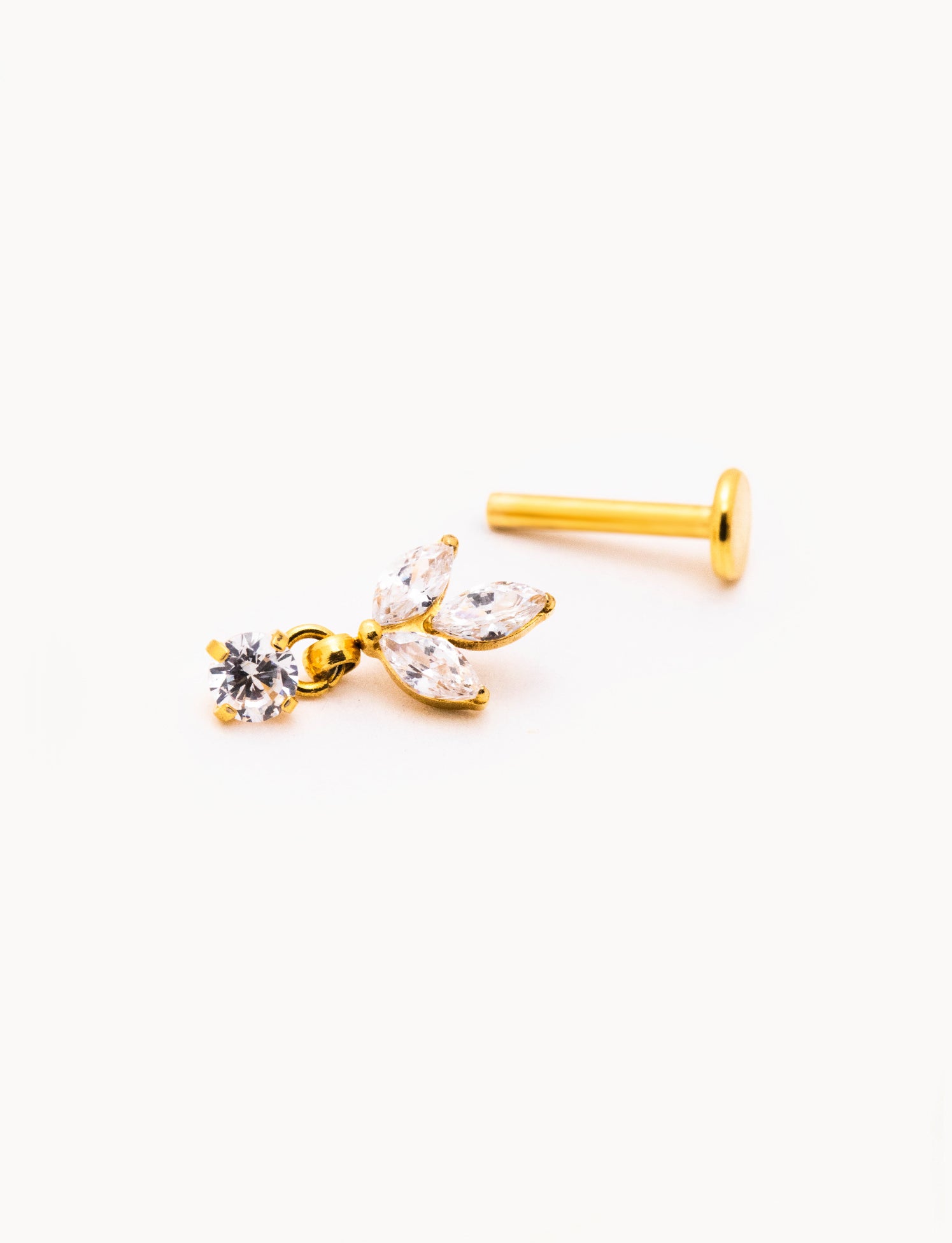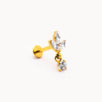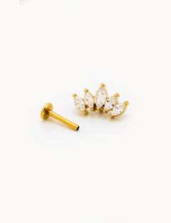 Piercing a barretta dritta in acciaio inossidabile con finitura dorata lucida, impreziosito da tre zirconi trasparenti taglio marquise disposti a formare un fiore di lotto stilizzato, con punto luce pendente. La montatura rialzata permette alla luce di riflettere sulle pietre, esaltandone la brillantezza. Chiusura a vite piatta sul retro per un fissaggio stabile e confortevole.